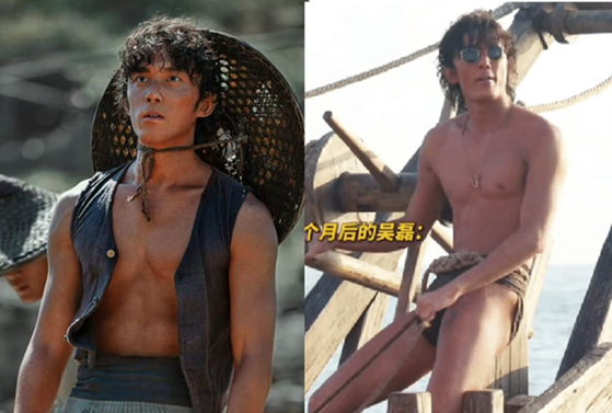 The production team also released a costume fitting video of Wu, showing him already tanned for the role and wearing a khaki vest with black shorts. Director Guan Hu (管虎), watching nearby, remarked, “Even that vest feels like too much!” Later, Wu appeared shirtless in just khaki shorts. After the photos were taken, he shyly admitted, “I feel so embarrassed—I wasn’t ready!” The director added, “The real fishermen didn’t wear anything down there,” and then instructed the team to shorten his shorts even more.